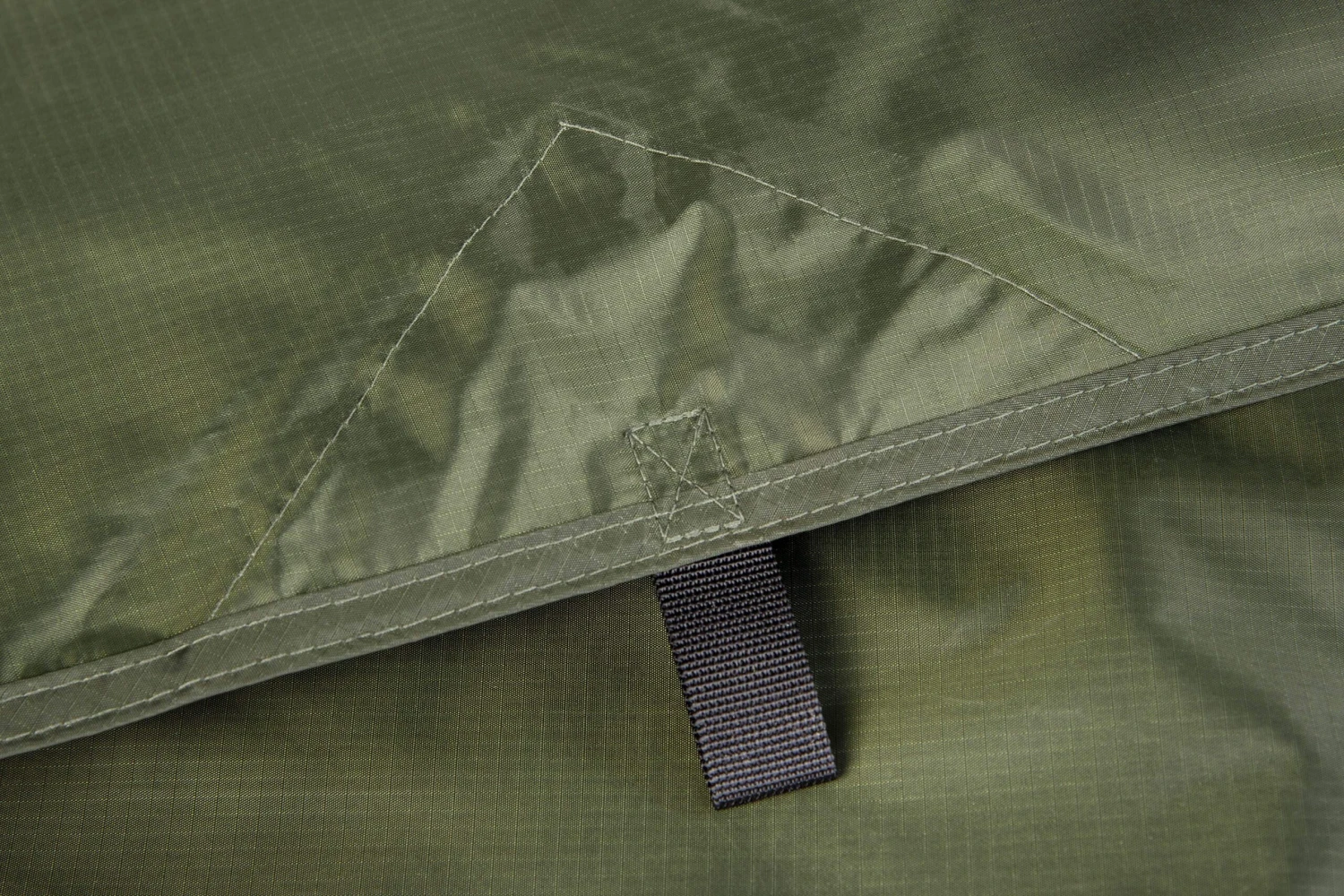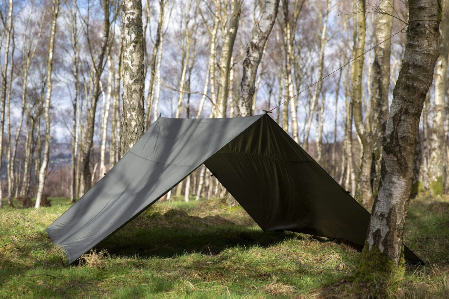 The tarp is made from waterproof (5,000HH) and durable (190T) polyester, providing a reliable shelter in unreliable weather. Polyester has a lower stretch than most fabrics, allowing a taught and secure pitch. All attachment points are reinforced with bar-tack stitching to be extra hardwearing.