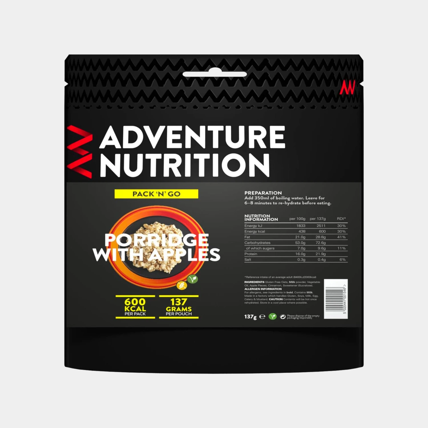 Adventure Nutrition Pack ‘n’ Go has been developed by nutritional experts to provide instant camping and trekking food. Each meal has a fixed 600kcal of energy, to fill you up before you start the day/crawl into your sleeping bag.