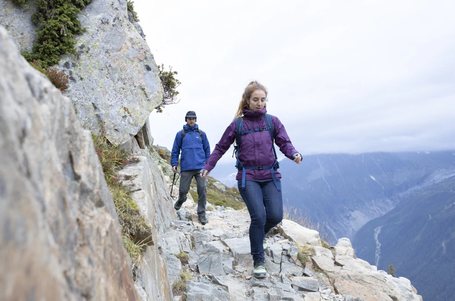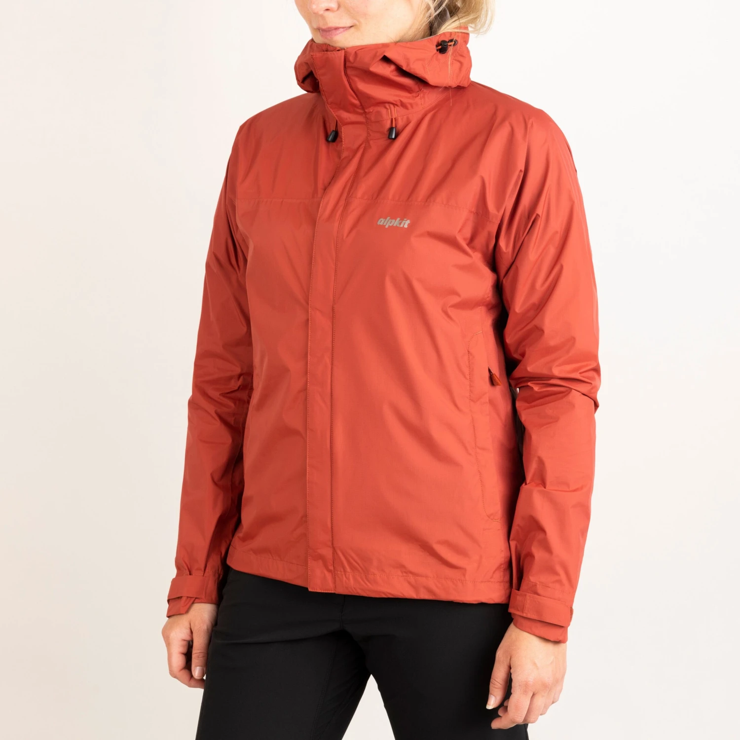 The Atalanta uses a lightweight 2.5 layer construction. This half layer is a super-thin protective print that reduces weight whilst still protecting your waterproof membrane from wear. This also makes the fabric nice and flexible for moving in and stashing away easily in packs.