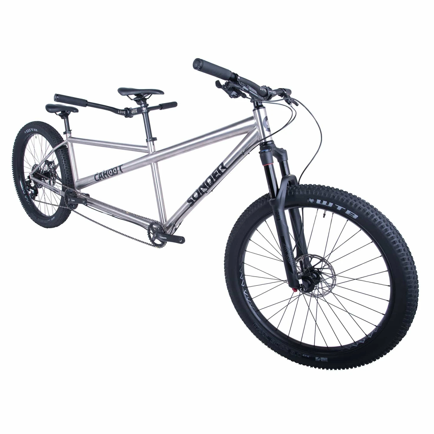 Ride together no matter the road you travel. Tackle steep singletrack, flow down descents and ride fully loaded on tarmac. A capable bespoke hand made tandem mountain bike designed for your size, geometry and specification. Made from aeronautical grade titanium and with a 10 year guarantee.