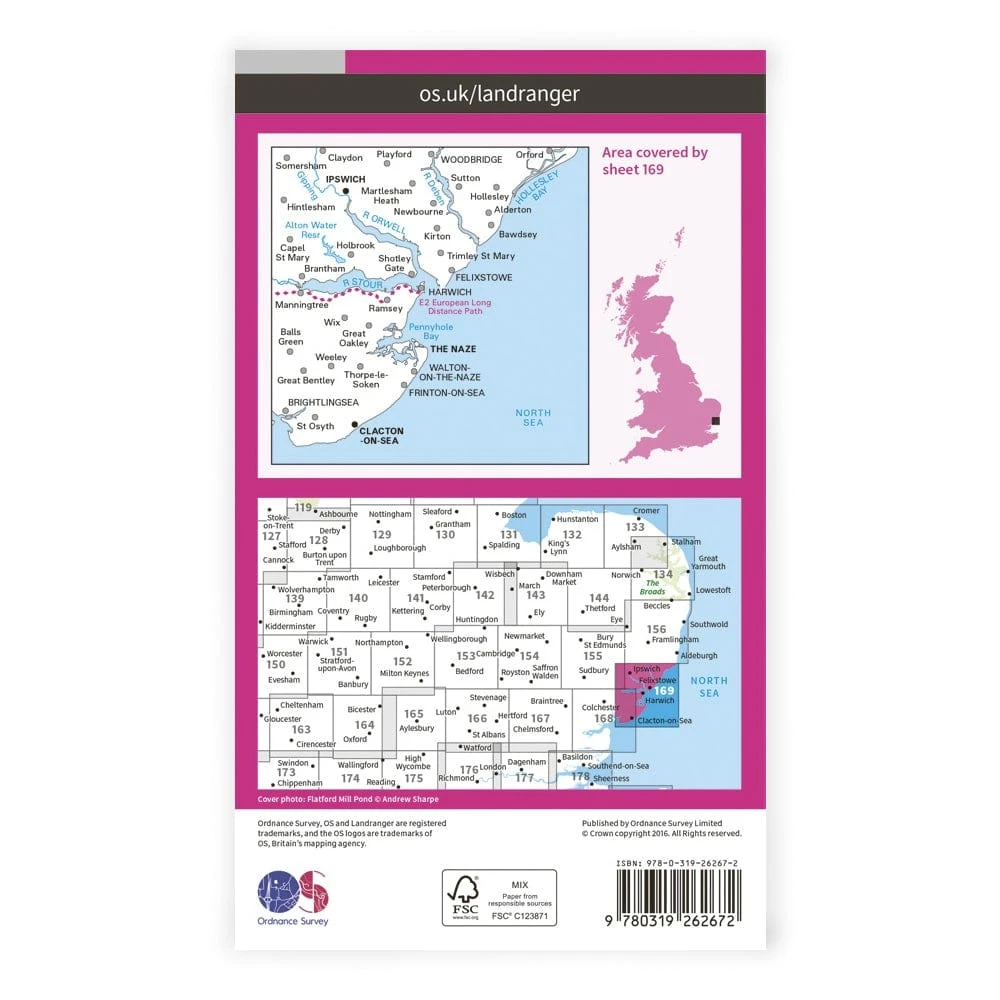 Landranger 169 covers the south Suffolk and north Essex coast and the Suffolk Coast and Heaths AONB.