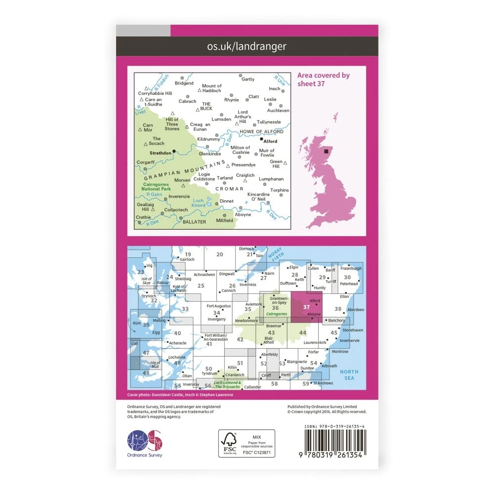 Landranger 37 covers the north-eastern edge of Cairngorms National Park and the Grampian Mountains of west Aberdeendshire.
