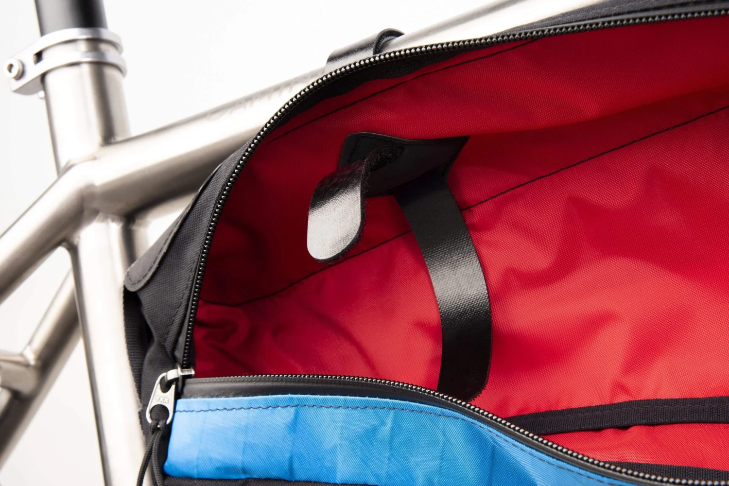 The Possum is super spacious for its size, giving you plenty of packing space for long day rides or bikepacking trips. The zipped main compartment has internal Hypalon tabs on the top to strap tent poles to. A mesh pocket on the inside gives you somewhere to store batteries or power packs with a concealed front-facing cable port to connect them to your lights, devices or dynamo hub. And there’s a thin accessory pocket on the other side for small, thin items like your phone or cards.