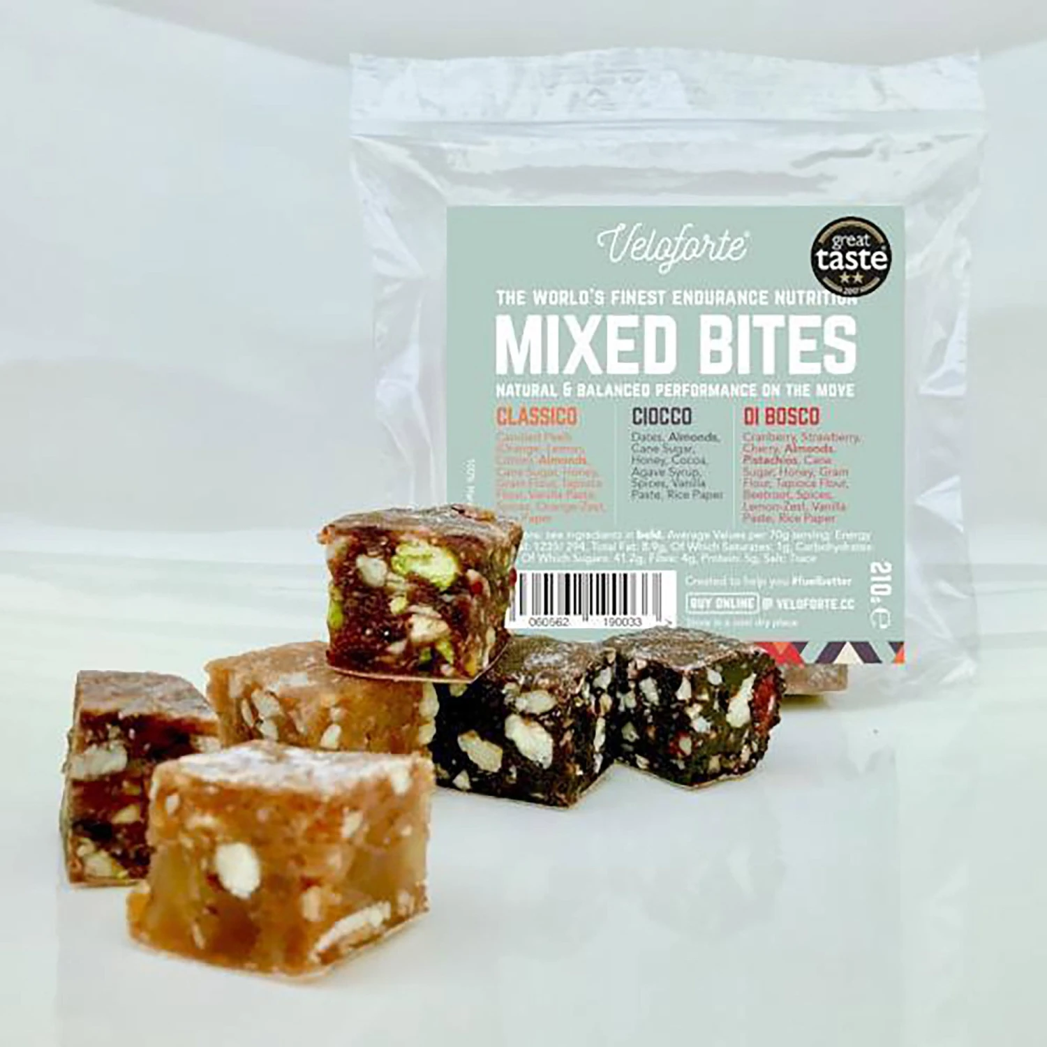 Veloforte bites bags contain bite-sized chunks of the three following bars for that easy-to-access, ‘little and often’ refuelling without the faff wrappers. All the bars are naturally gluten, dairy, egg, additive, and preservative free.