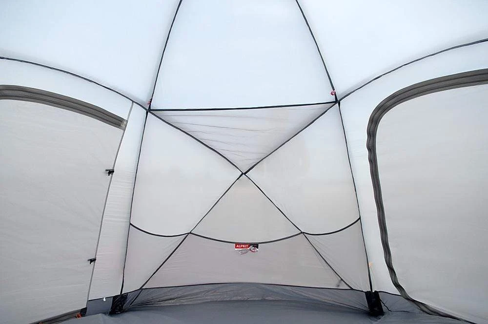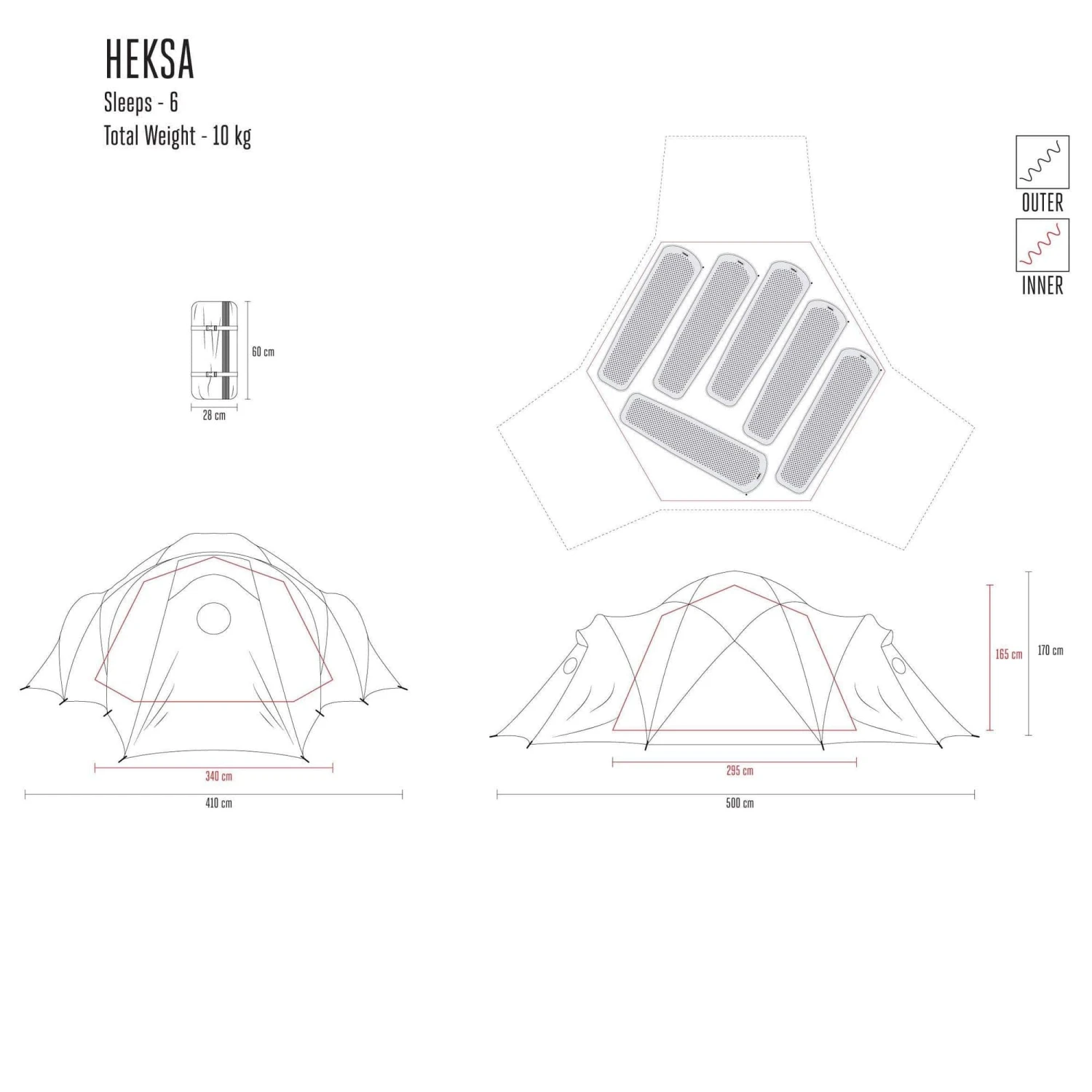 Heksa is inner pitch first, with a hexagonal geodesic construction to withstand fierce weather conditions. Colour-coded poles make pitching simple; the three vestibule porches can be pegged out and tensioned or docked onto a Kangri. Snow valances offer reinforcement and extra protection when the weather really sets in.
