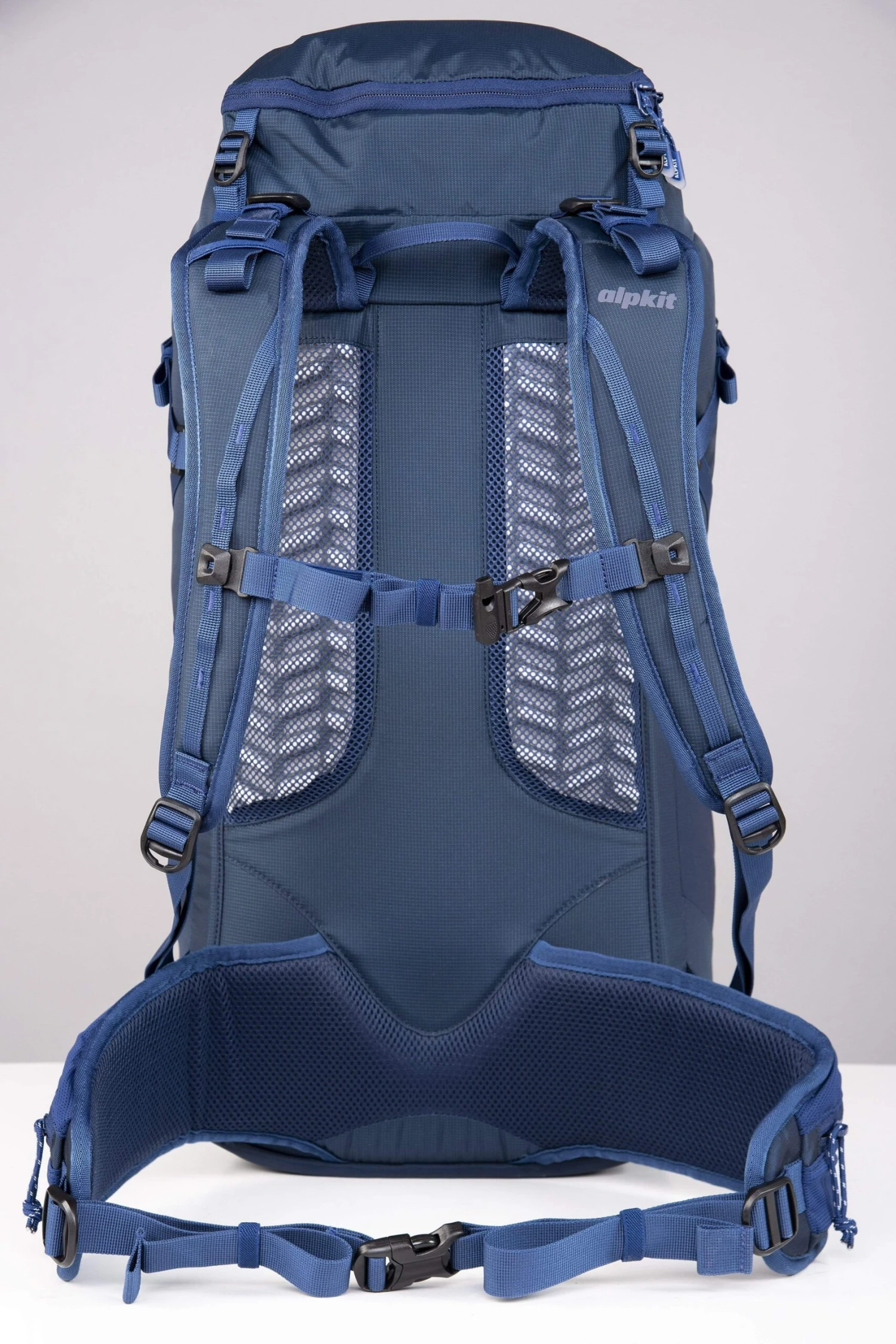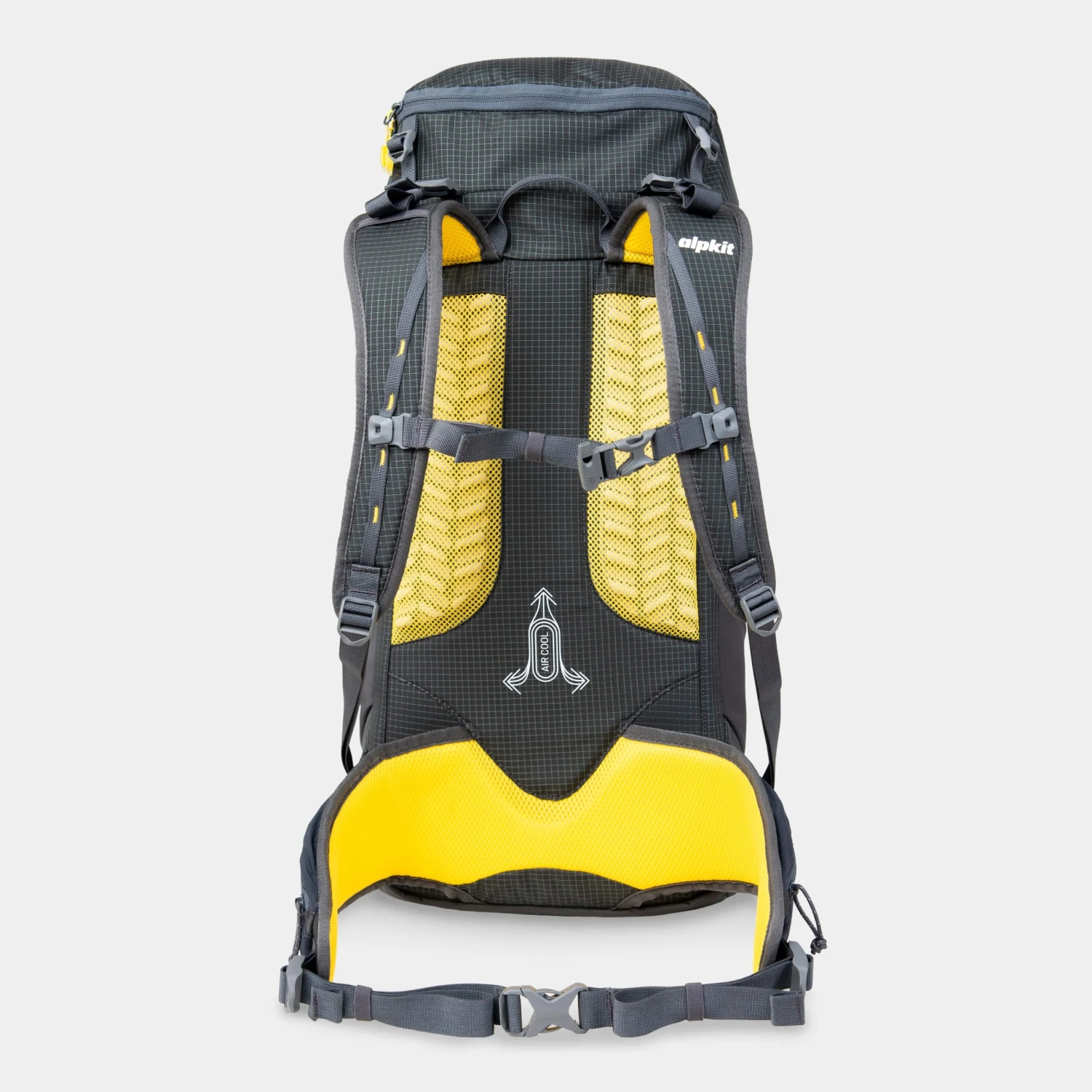 Its comfort and stability in a slim package make it ideal for mountaineering. The Aircool back system is internally stiffened to give load-bearing structure while venting channels create excellent airflow. The fit is highly adjustable with load lifting adjusters on the shoulder straps, a repositionable sternum strap and hip fins for stability.