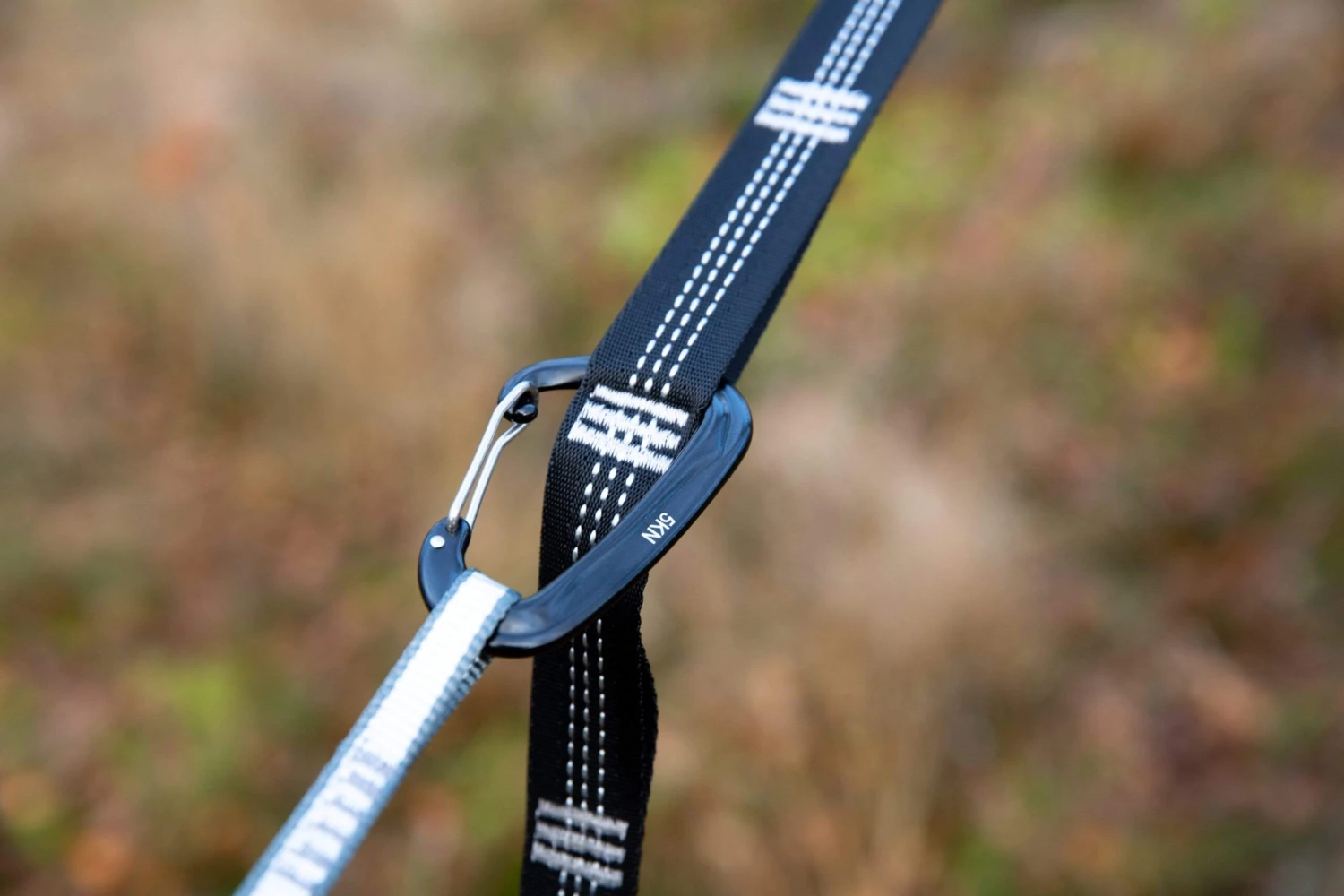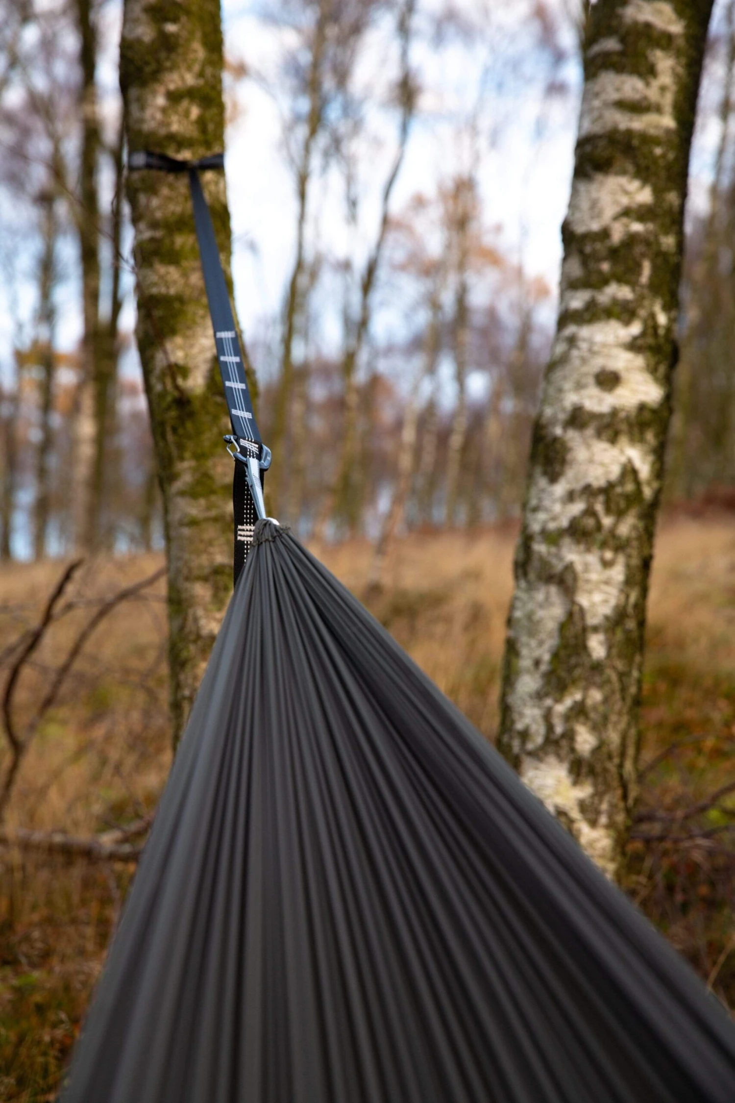 The Mora includes a simple but effective suspension system for minimal faffing when you’re setting up and taking down. Simply wrap the tree straps, thread them through the loop and clip to the provided karabiners.