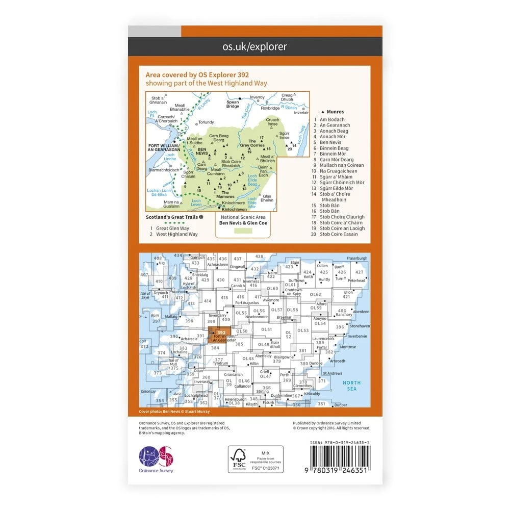 Explorer 392 covers Ben Nevis, Fort William, The Mamores, The Grey Corries, Kinlochleven & Spean Bridge.