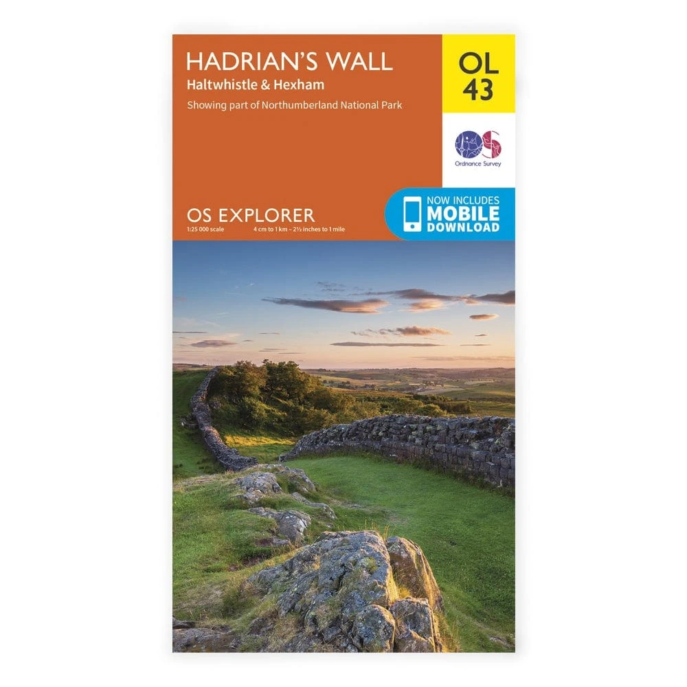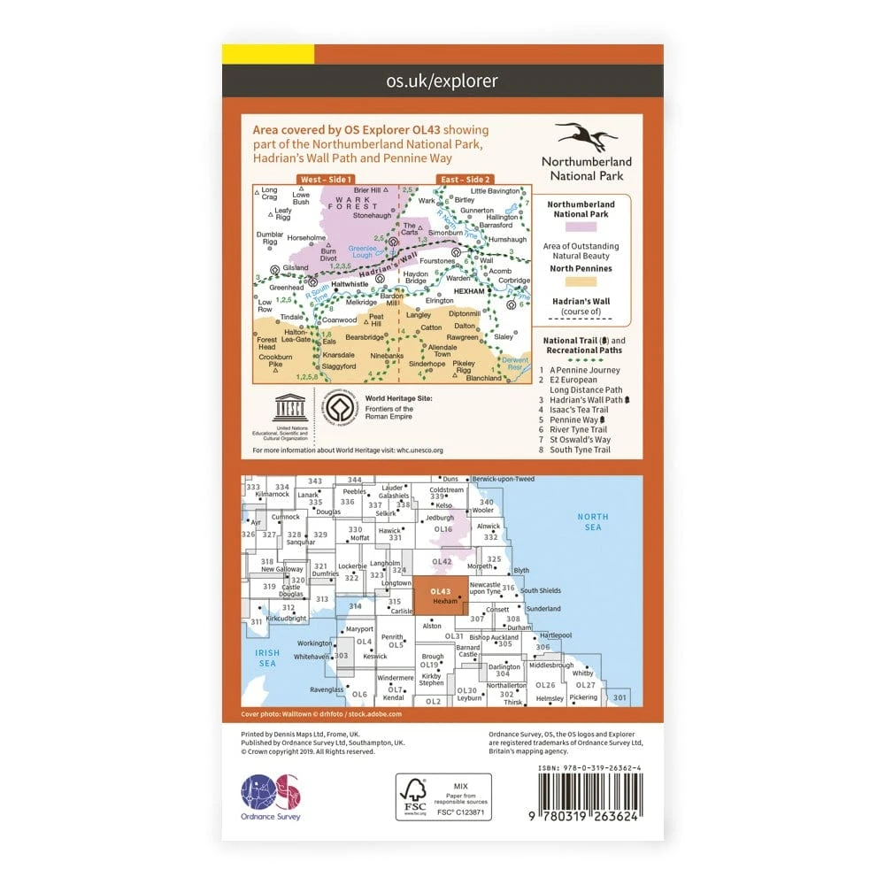 Explorer OL43 covers part of the Northumberland National Park, including the Pennine Way, Hadrian’s Wall Path, E2, Hexham, Cumbria and Northumberland.