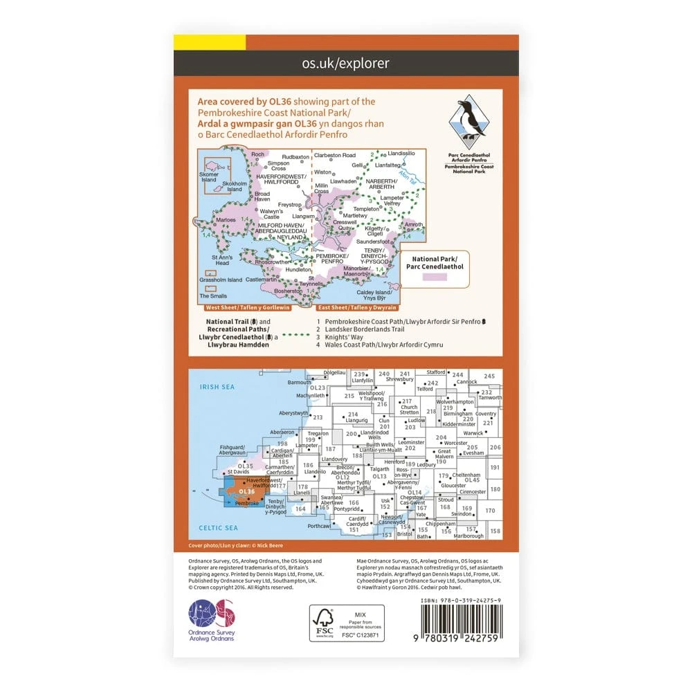 Explorer OL36 covers the South Pembrokeshire Way, including Johnstone, Daugleddau Trail, Knights’ Way and Dyfed.