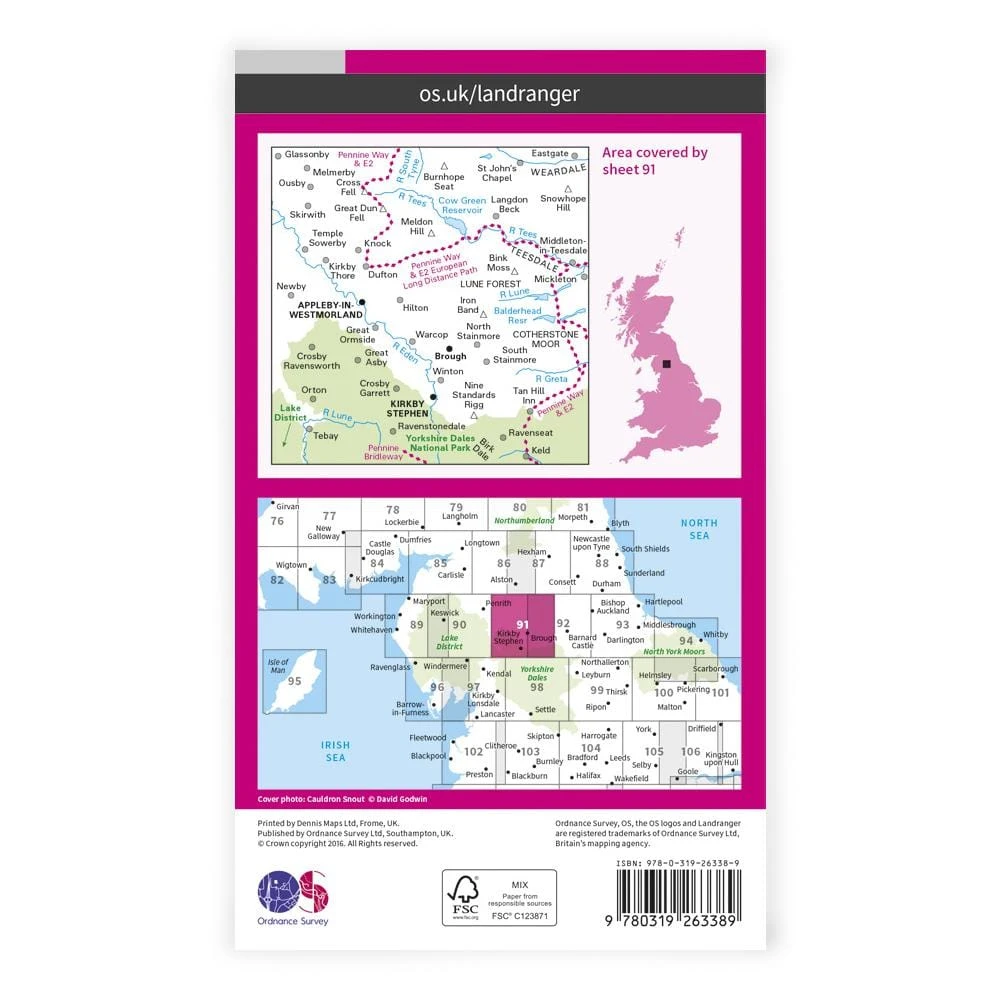 Landranger 91 includes a section of the Pennine Way and covers the edge of the Yorkshire Dales and Cross Fell.