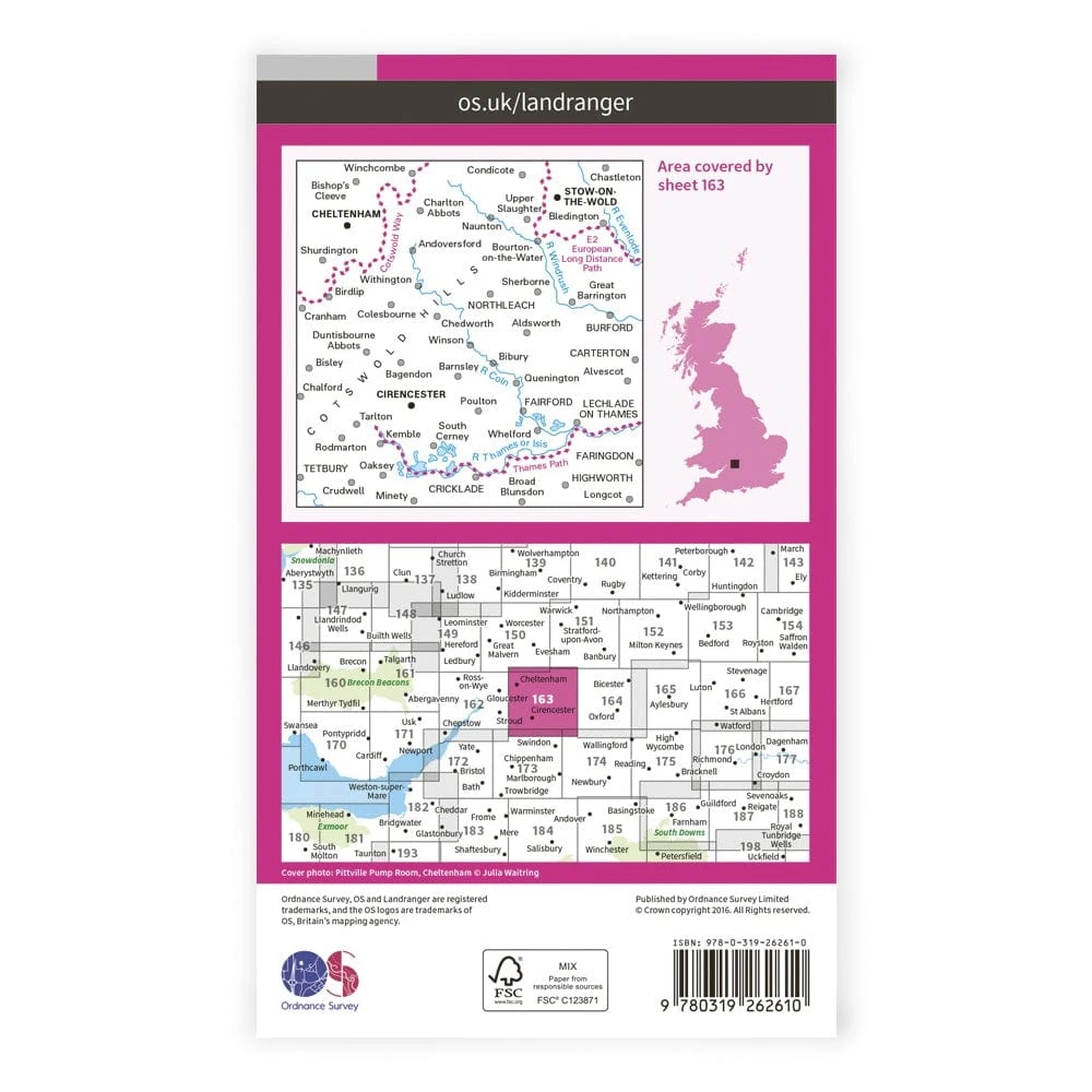 Landranger 163 covers east Gloucestershire and west Oxfordshire, including a large section of the Cotswolds AONB and the start/finish of the Thames Path.