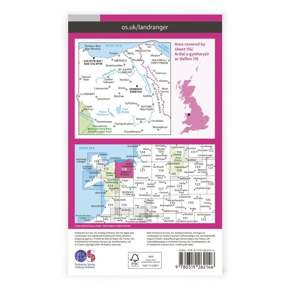 Landranger 116 covers Denbighshire and the North Wales coast, including the Clwydian Hills and the start/finish of the Offa’s Dyke Path National Trail.
