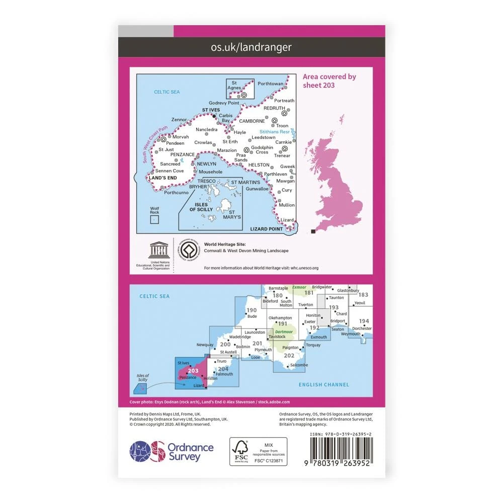 Landranger 203 covers south-west Cornwall from Redruth and Porthtowan to Penzance, Land’s End and the Lizard peninsula. It also includes the Scilly Isles and part of the South West Coastal Path.