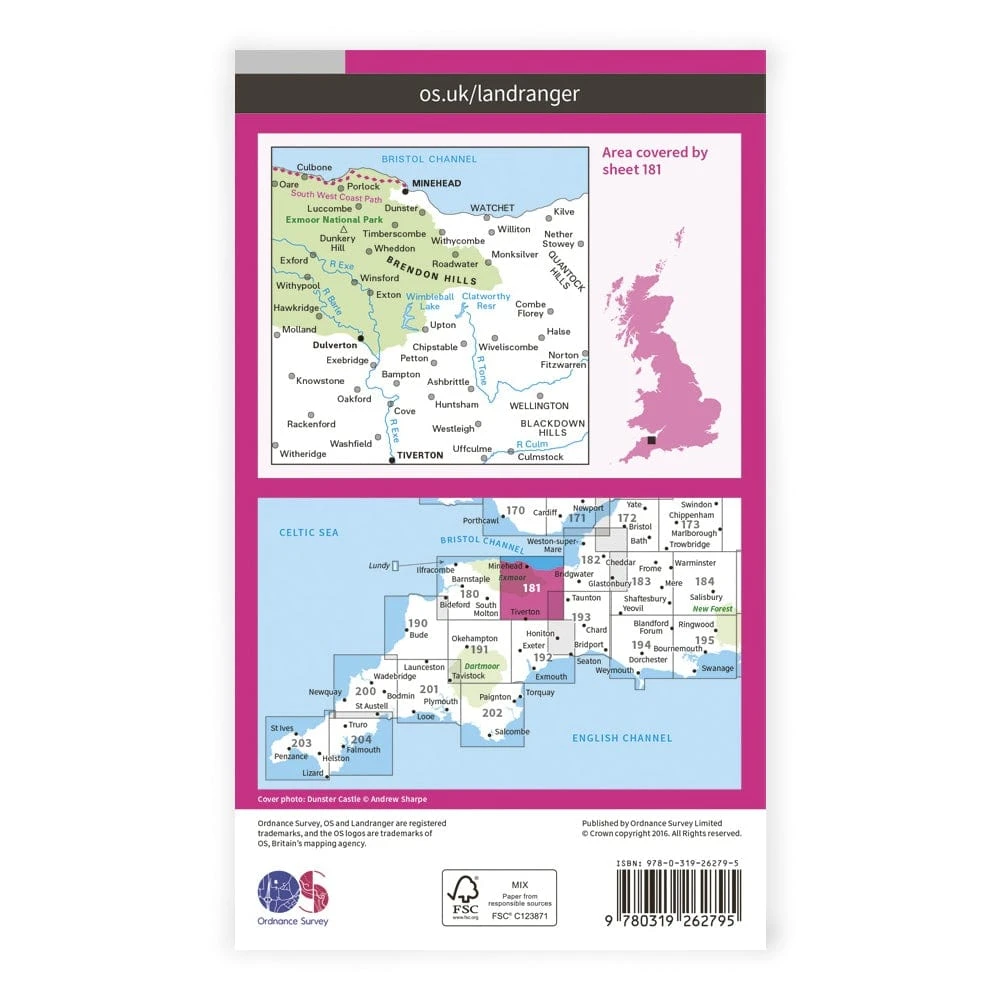 Landranger 181 covers west Somerset and east Devon, including Exmoor National Park, the Quantock Hills AONB and the start/finish of the South West Coastal Path.