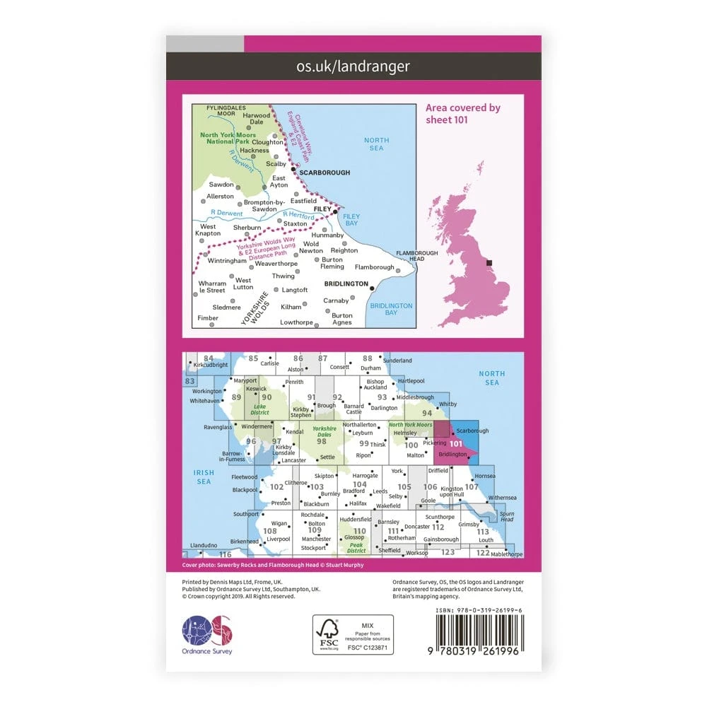 Landranger 101 covers the east Yorkshire coast either side of Flamborough Head, the south-eastern end of the North York Moors National Park and includes part of the Wolds Way and the Cleveland Way National Trail.