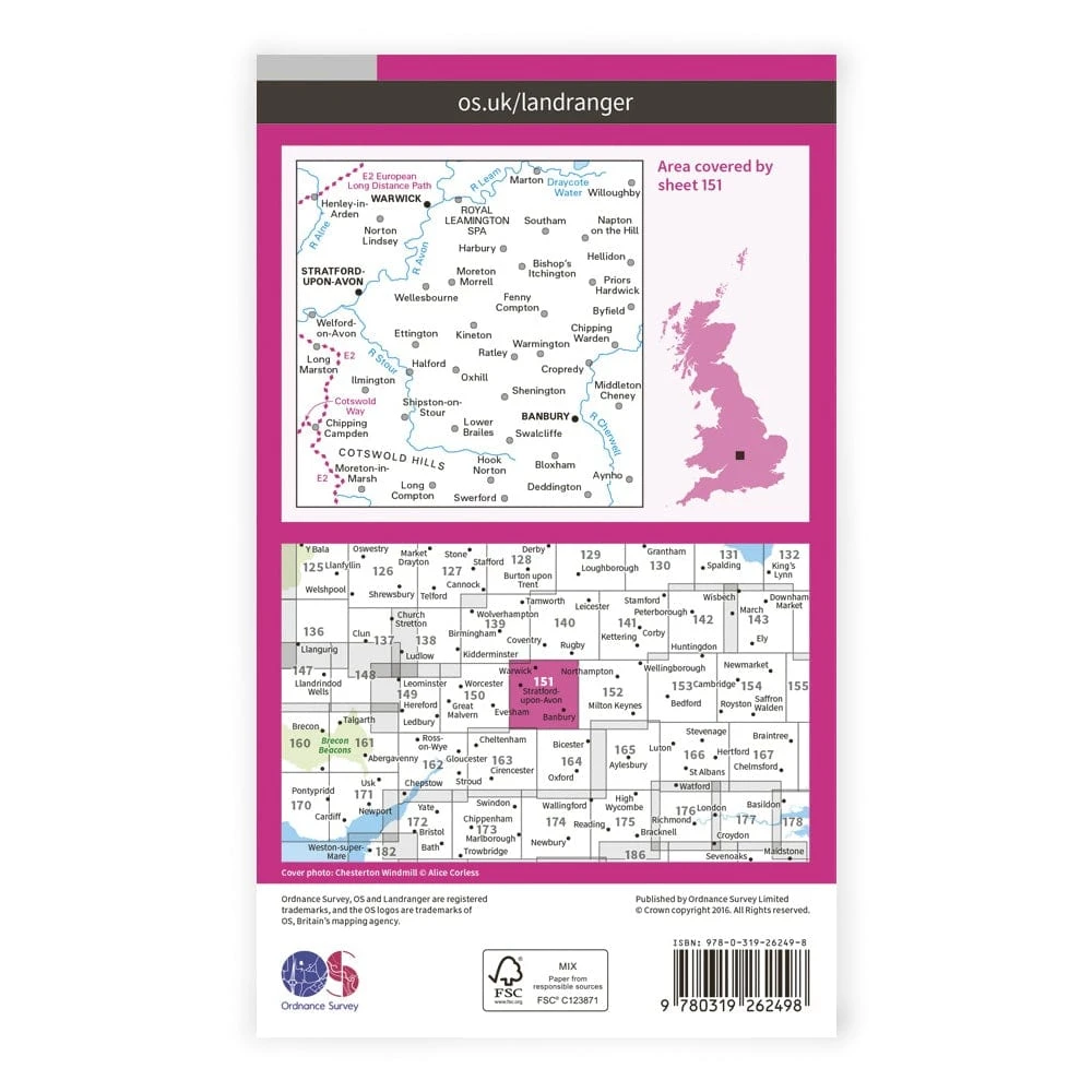 Landranger 151 covers most of Warwickshire, north-east Gloucestershire, north-west Oxfordshire and the north-eastern edge of the Cotswolds AONB.