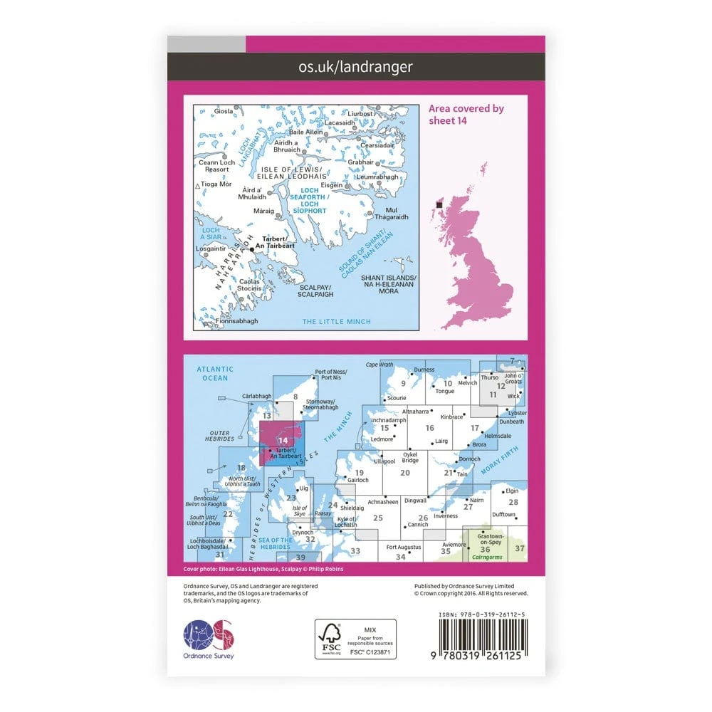 Landranger 14 covers North Harris and south-east Lewis in the Outer Hebrides (Western Isles).