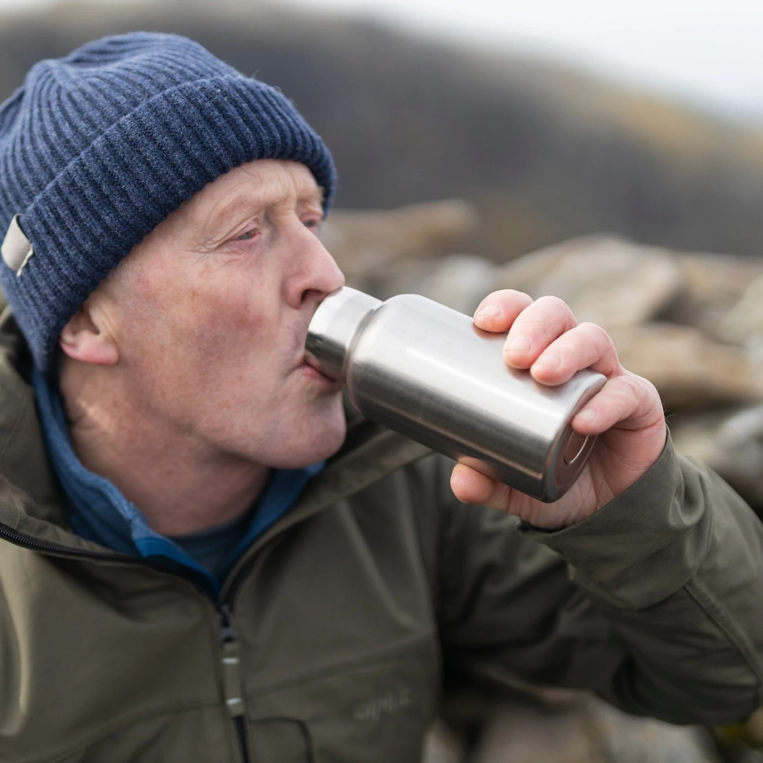 The Refresher is made of recycled stainless steel. The double wall construction works for both post-dip shivery hot chocolates mid-winter and ice-cold water for rehydrating after a roasting hot run.
