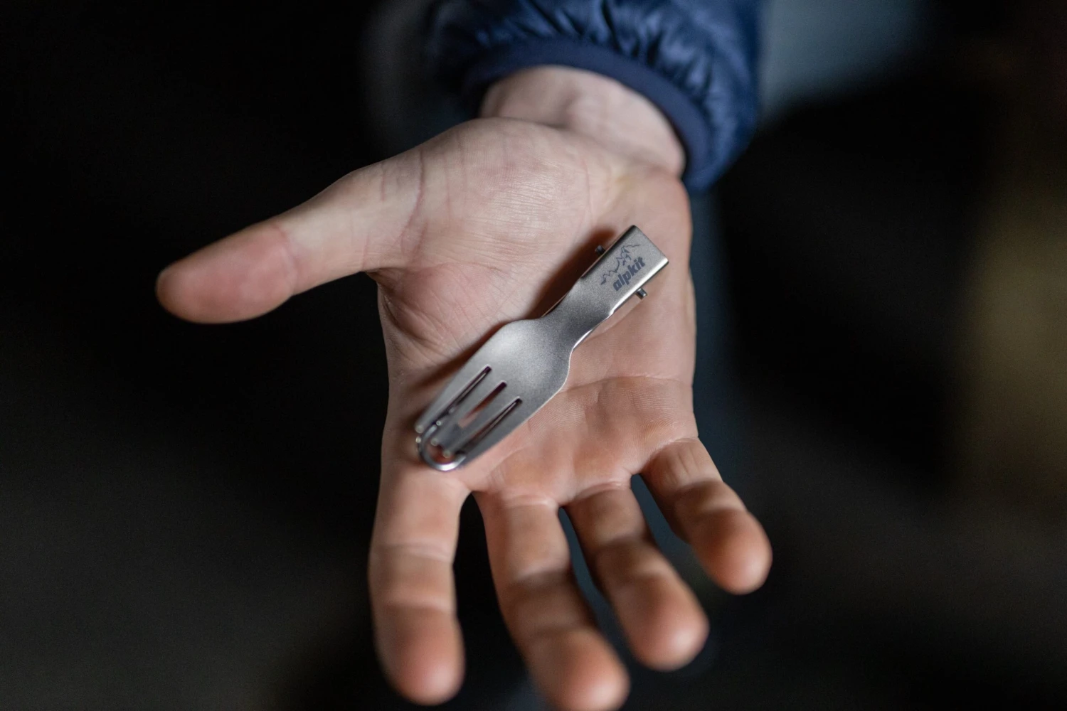 This titanium fork folds in half to reduce its length by 50% which means it can be stowed away conveniently in your camping mug. You don’t need weight in the handle which is why it is made from bent titanium wire. It uses the minimum amount of metal to give a comfortable grip with maximum weight savings. The wired handle snaps into place and is held secure by a sliding titanium bridge.