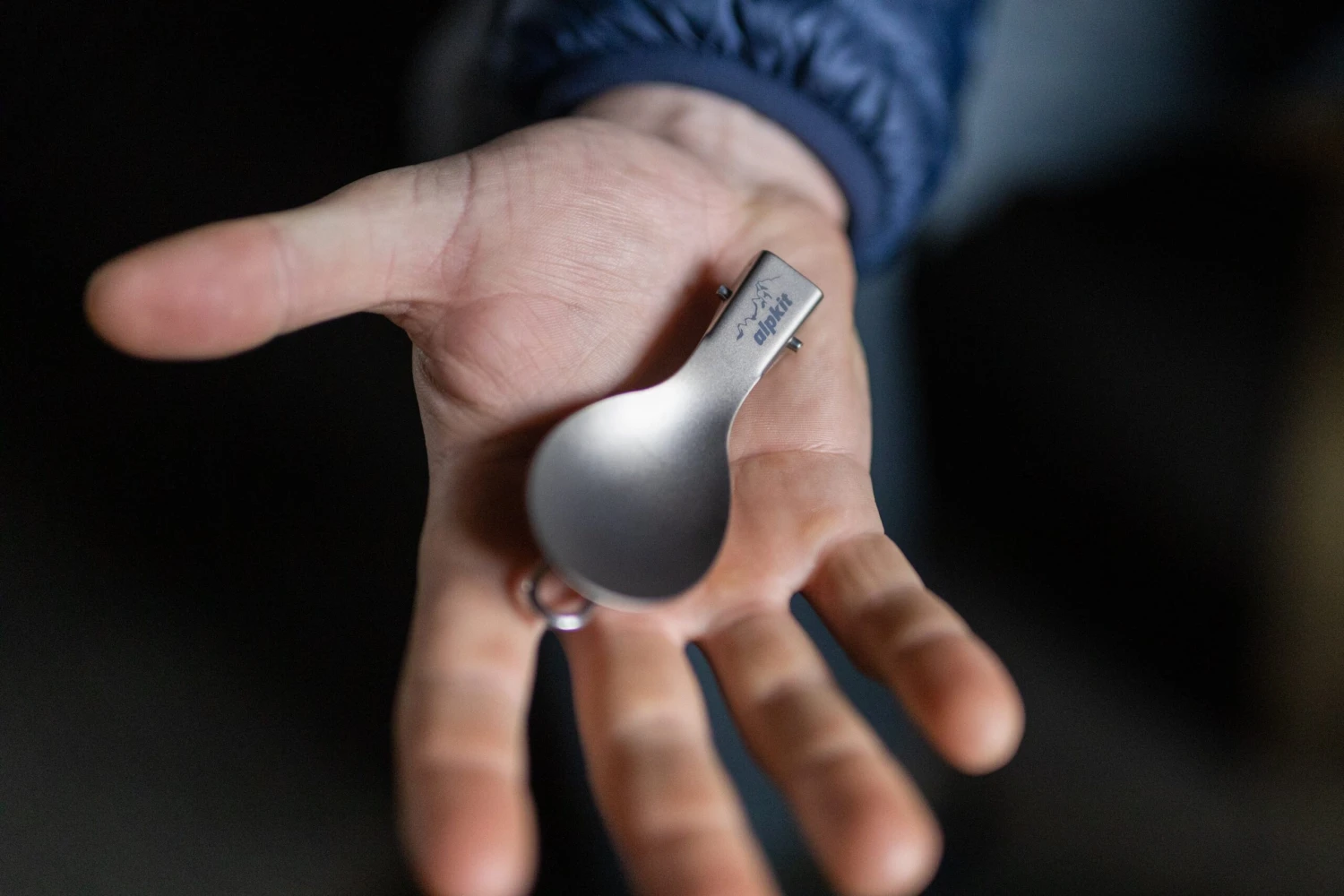 This titanium spoon folds in half to reduce its length by 50% which means it can be stowed away conveniently in your camping mug. You don’t need weight in the handle which is why it is made from bent titanium wire. It uses the minimum amount of metal to give a comfortable grip with maximum weight savings. The wired handle snaps into place and is held secure by a sliding titanium bridge.