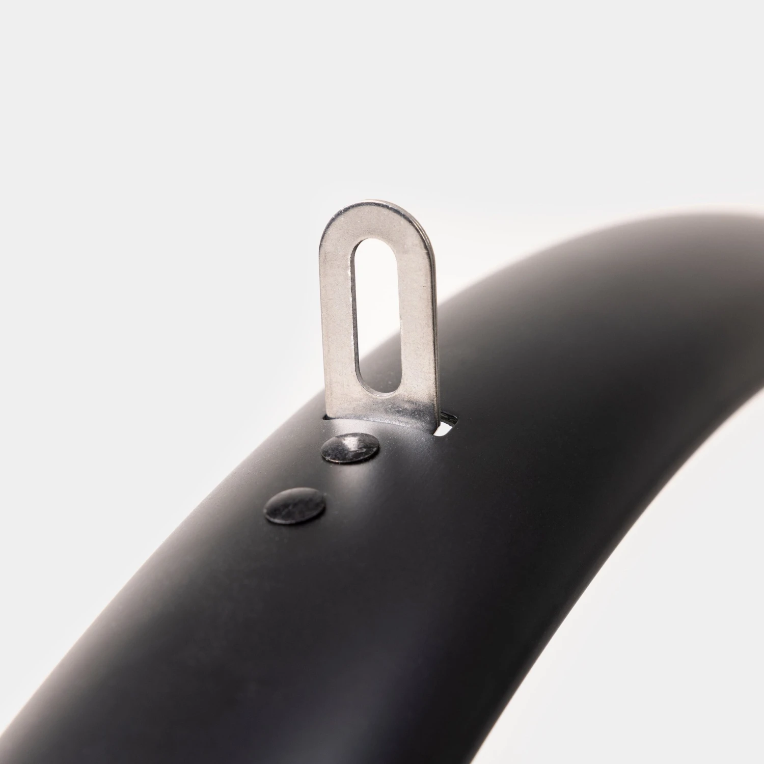 A lightweight aluminium mudguard for you and the bike. The Defender keeps both you and your bike cleanish and dryish on all-weather rides, we have no control over the water that comes from above!