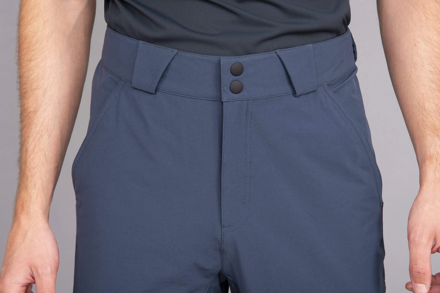 Strada performance fabric is light and breathable, with four-way stretch and a tailored cut. The shorts are articulated for your position on the bike, with a high back and no-stretch waist so they don’t ride down. The legs are cut to be well-fitting yet unrestrictive over your thighs and sit just above the knee, leaving room for knee pads and layering comfortably over undershorts if you need them. They feature deep front pockets and zipped hip pockets that sit out of the way when you’re riding.