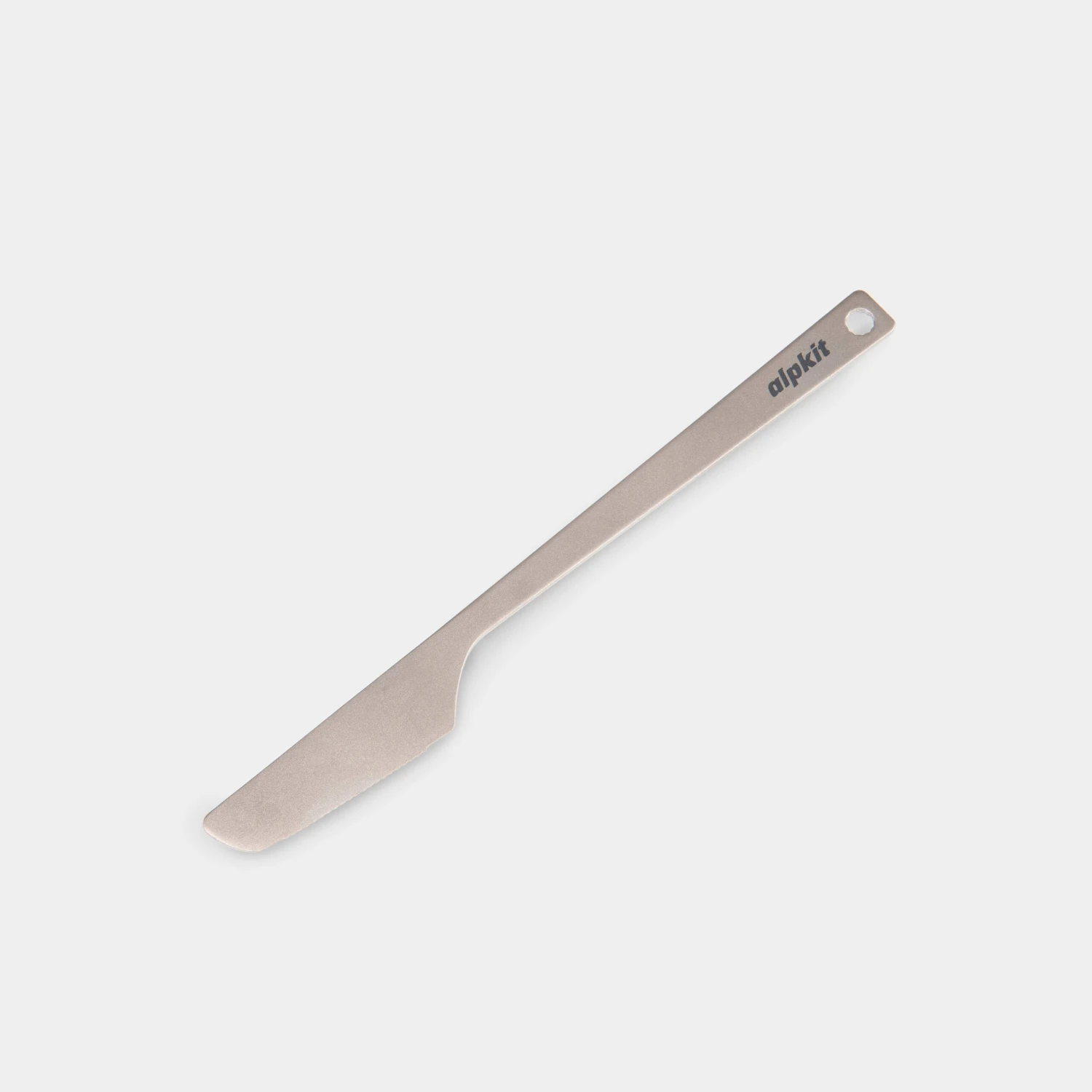 Compact and lightweight titanium knife for slicing pumpernickel, spreading jam on scones, and generally chopping things.